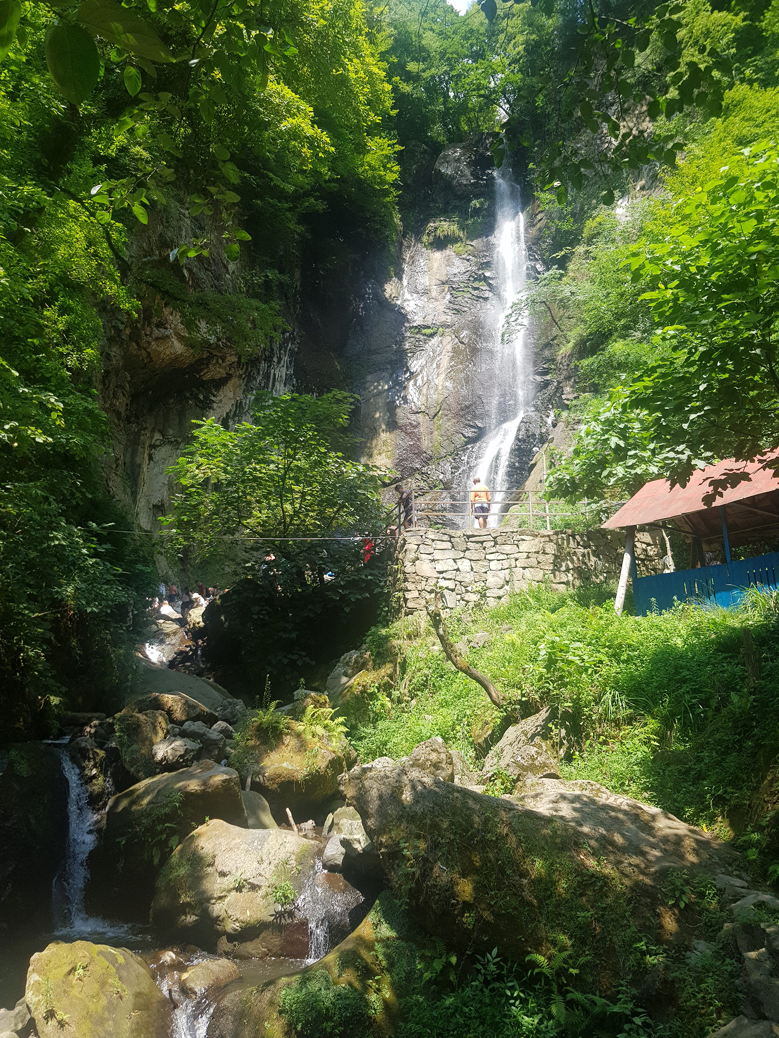 Всего в 400 метрах от моста находится водопад Махунцети, один из самых красивых и мощных водопадов Аджарии. Прохладная вода водопада, падающая каскадом с высоты, создает каменную чашу для купания — идеальное место для освежающего погружения в летнее время.